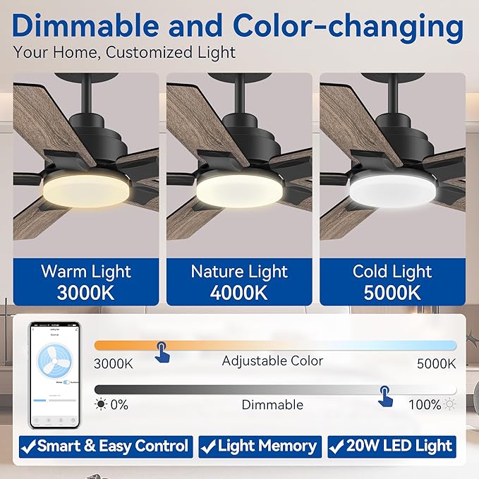 - 【Dimmable& Color-changing LED Light】This modern farmhouse ceiling fan comes with color-changing lights that offer 3000K warm yellow light, 4000K daylight, and 5000K white light options. The lights are dimmable from 0-100 percentage, allowing you to create the desired atmosphere for working, leisure, or parties. With 2000 lumens, the LED lights are bright enough to illuminate the entire master bedroom.
