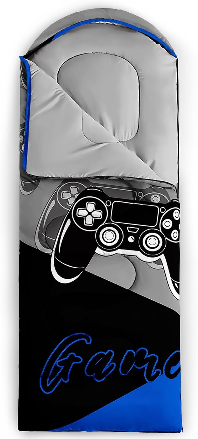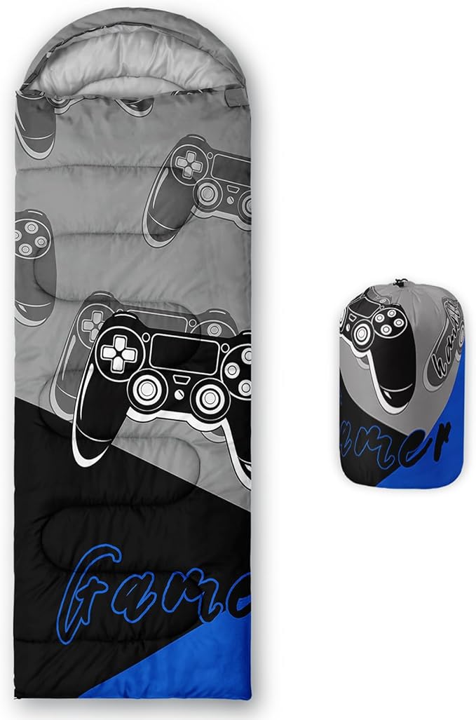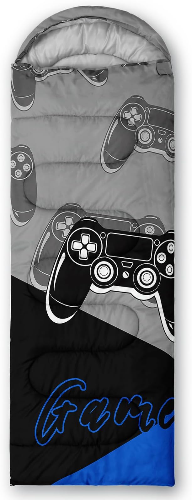 - Unique Gamer Design:This Gamer pattern sleeping bag is made of 3D digital printing with vibrant colors and patterns,size: 31W x 90L inches,temperature range: 32℉-77℉ (0℃-25℃),it also also have a weather resistant waterproof design to keep you warm and prevent you from any dampness,can be used in 3 seasons
