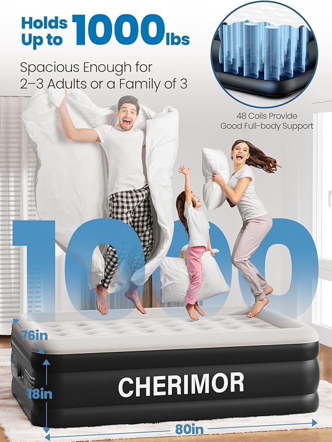 - 3-Min Quick Inflation & Compact Storage: Inflate or deflate your air bed in just 3 minutes with the built-in 120V electric pump. Measuring 80″×76″×18″, this air mattress king with built in pump provides spacious comfort while packing away neatly into the included backpack for easy storage and travel. Perfect for moving, camping, or hosting guests—set up and store away with zero hassle