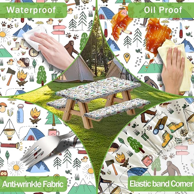 JAWO Picnic Table Covers with Bench Covers Camping Big Foot Adventure Tablecloth 8FT for 8 Person Fitted Picnic Table Cover with Elastic Windproof Waterproof Fabric, Camp Accessories Patio & Outdoor