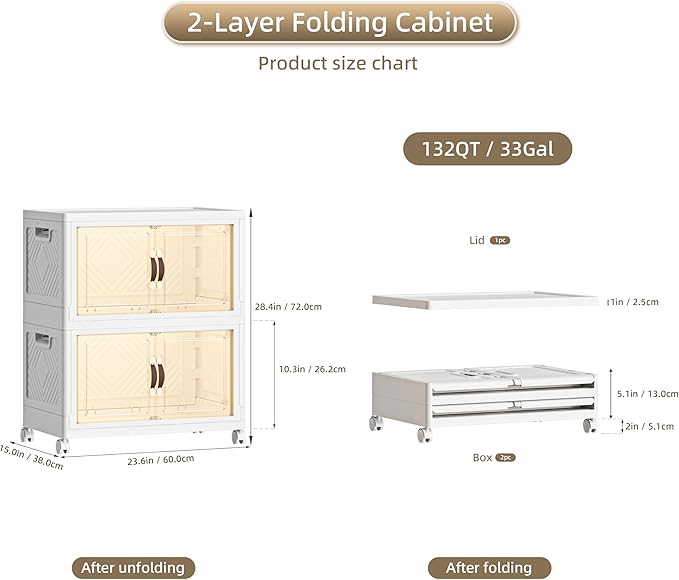 132 QT / 33 Gal White Storage Bins with 1 Lid - Collapsible Stackable Cabinet Organizer w/Wheels & Magnetic Doors, Plastic Storage Box for Office Closet Organization