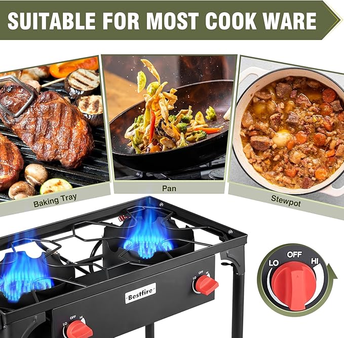 BESTFIRE 2 Burner Camping Stove,150,000 BTU High Pressure Outdoor Propane,4ft 20 PSI Adjustable Regulator Hose With Removable Legs for Backyard Cooking Camping Home