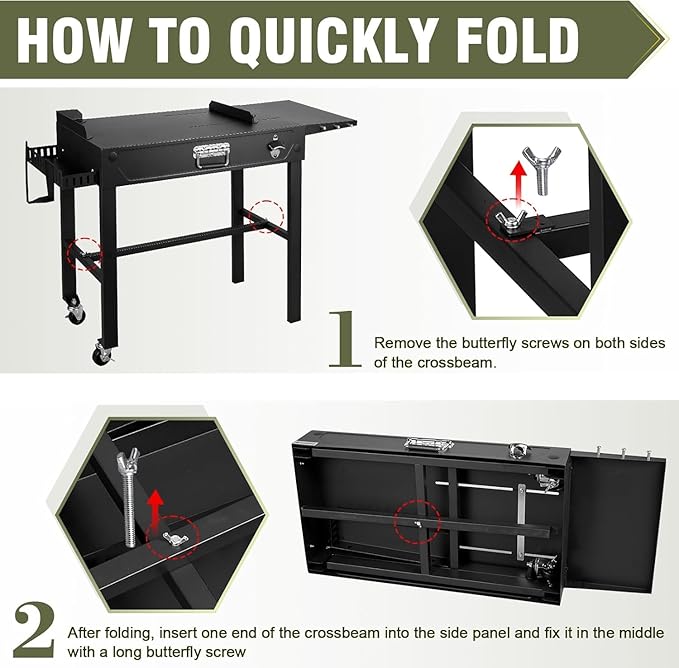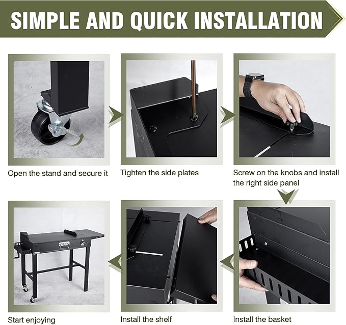- đŠăComplete PackageăIncludes: 1 grill cart, 1 integrated stainless steel 2-burner propane grill, 2 ignition plates, 1 food rack, 1 propane hose, paper towel holder, magnetic tool bar, condiment rack, storage shelves, hooks, and wheel locks.