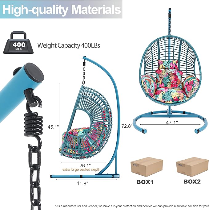 - EASY ASSEMBLY and MAINTENANCE: Designed for hassle-free setup with included instructions and all necessary tools. The removable cushion covers are also machine washable for easy maintenance.The stand allows you to place the hanging chair wherever you need it.