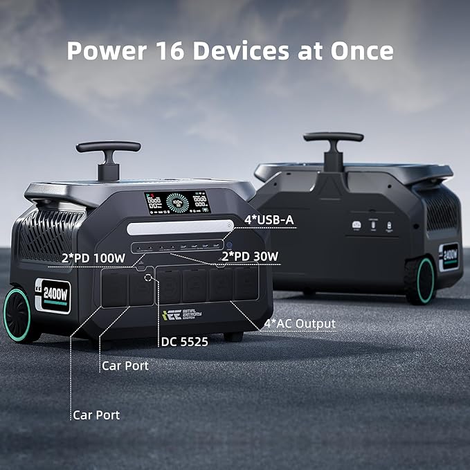 - 【Power 16 Devices Simultaneously】2400W 2048Wh battery generator can power 99% of appliances through 16 versatile outlets (4 AC outlets, 4 USB-A, 4 Type-C PD ports, 2 cigar lighter, 2 DC5525). The all-in-one solar powered generator is an indispensable choice for a household emergency, outdoor off-grid activities, camping or traveling and as home backup power for most appliances, phones, laptops, power tools, cooking utensils, vehicle-mounted products, and remote-controlled aircraft.