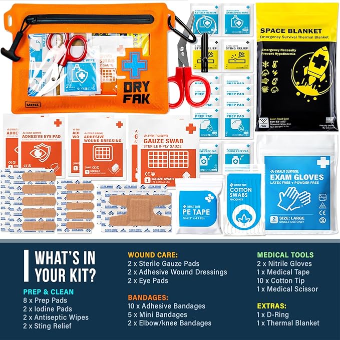 - Must-Have Essential for Every Outdoor Adventure: Whether you're hiking rugged trails, paddling downriver, this compact waterproof first aid kit is built to keep you prepared. Trusted by backpackers, it’s the perfect first aid kit for hiking, backpacking, kayaking, fishing, or biking. This personal first aid kit weighs next to nothing but delivers serious peace of mind. Ideal as a hiking medical kit, bike first aid kit, backpack first aid kit, or even a boat emergency kit.