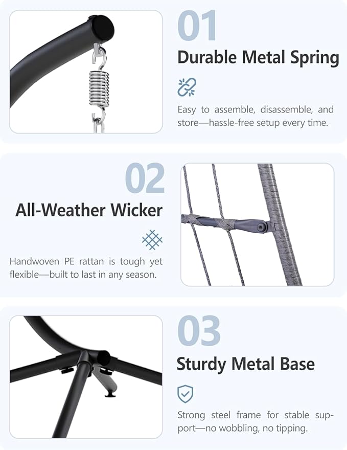 - Heavy-Duty & Rust-Resistant Build: Made with a powder-coated steel frame and hand-woven all-weather wicker, our hanging egg chair supports 350 lbs and resists rust, fading, and wear better than most outdoor egg chairs
