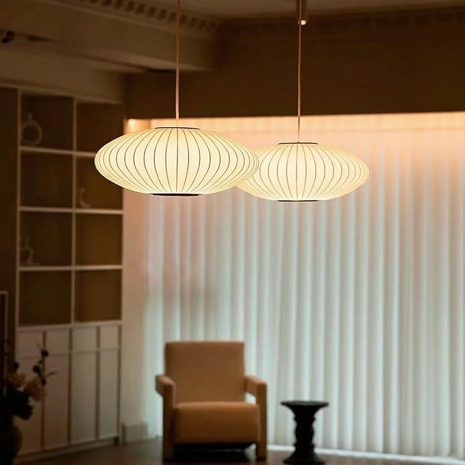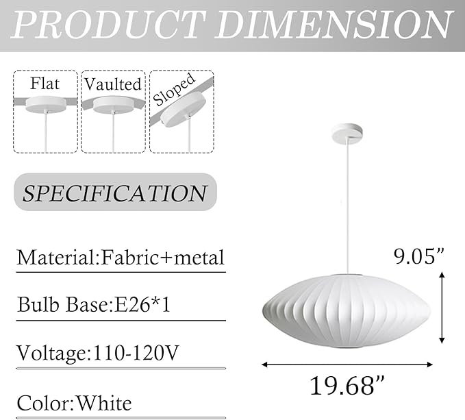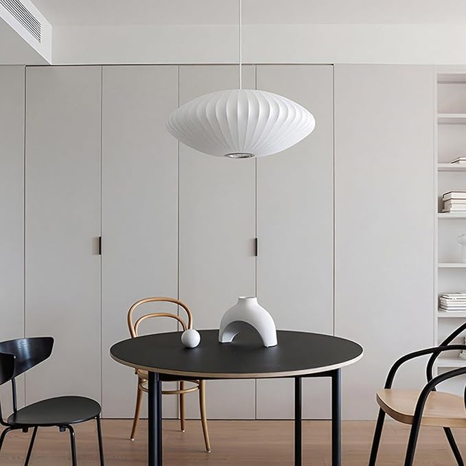 - Funky Saucer Pendant Light Design:The Bubble Pendant Lamp perfect combination of nordic style, cloth fabric frame and beautiful white Stretch shade. The simple frisbee shaped lampshade are perfectly integrated, brings country cottage and farmhouse aesthetics. Clean and modern aesthetic design, simple and timeless, and it is a different experience to install in any space of your home