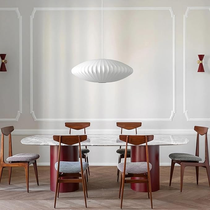 - Adjustable Hanging Pendant Light Fixture: The Round White Pendant Light for dining room ceiling features one cord length:39.4 inches, the cord matches the white lamp body perfectly. You can adjust the hanging height to achieve various arrangement layouts by decreasing cord length. If you have very high ceilings, we could send you longer hanging cord replacement