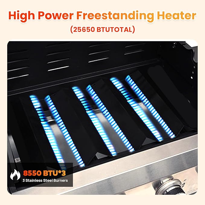 - 🔥 High-Performance Stainless Steel Burners - This propane gas grill features 3 powerful stainless steel burners delivering a total of 25,650 BTU per hour. With a built-in piezoelectric ignition system, you can enjoy instant start-up—just push and turn the control knob. It’s reliable, efficient, and ready to fire up your outdoor meals in seconds.