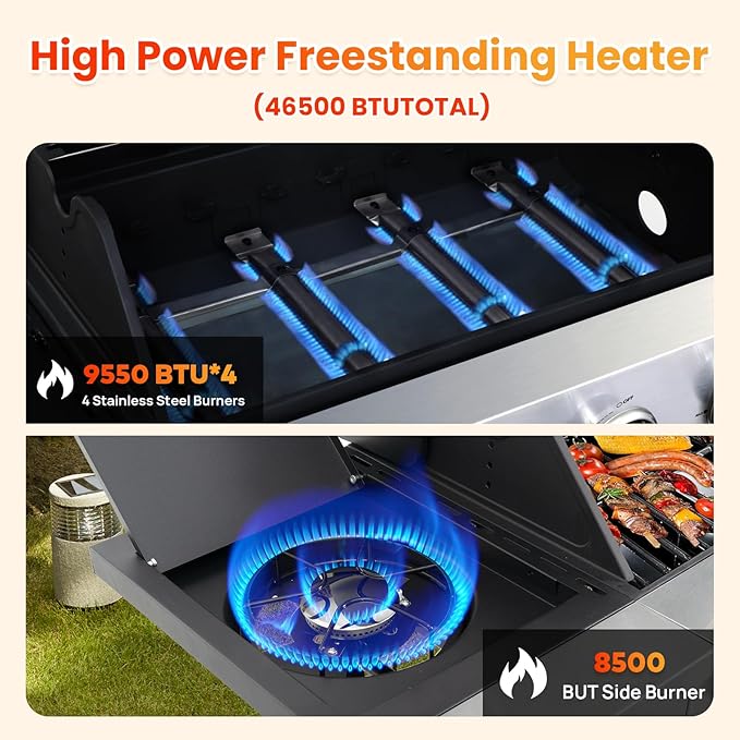 - 🔥 High-Performance Stainless Steel Burners - This propane gas grill features 4 powerful stainless steel burners and side burner delivering a total of 46,500 BTU per hour. With a built-in piezoelectric ignition system, you can enjoy instant start-up—just push and turn the control knob. It’s reliable, efficient, and ready to fire up your outdoor meals in seconds.