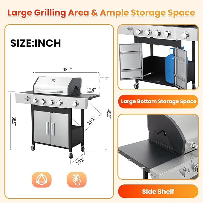 - 🔥 High-Performance Stainless Steel Burners - This propane gas grill features 4 powerful stainless steel burners and side burner delivering a total of 46,790 BTU per hour. With a built-in piezoelectric ignition system, you can enjoy instant start-up—just push and turn the control knob. It’s reliable, efficient, and ready to fire up your outdoor meals in seconds.
