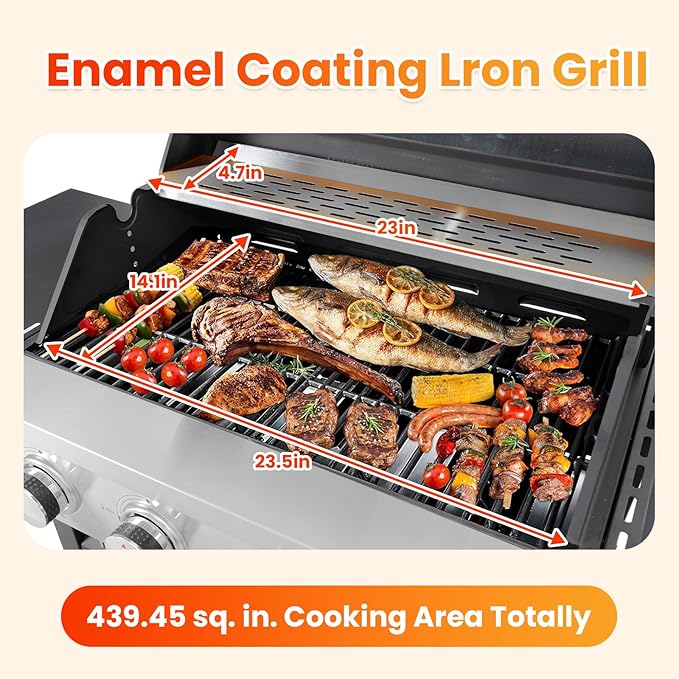 - 🍖 Spacious Cooking & Warming Areas - Equipped with porcelain-enameled wire grates, this gas grill offers a generous 23.5" x 14.1" cooking area plus a 23" x 4.7" warming rack. You’ll have ample space to sear steaks, grill burgers, and keep side dishes warm—all at the same time. Perfect for family meals and outdoor gatherings.