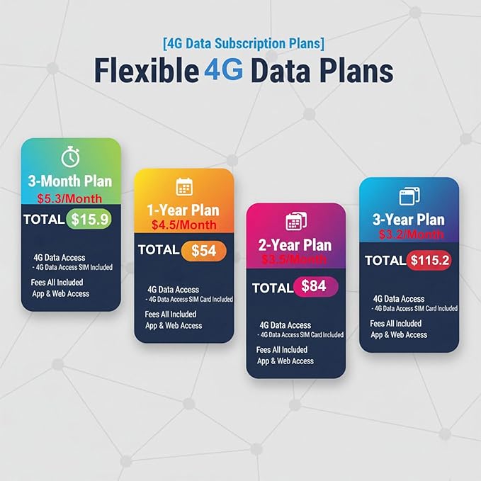 - Flexible Subscription Plans: No hidden fees or contracts! Choose 3 months ($5.3/month, $15.9 total—great for short-term rentals) or 12 months ($4.5/month, $54—ideal for yearly vehicle security). Provides a stable SIM card, stable and no disconnection