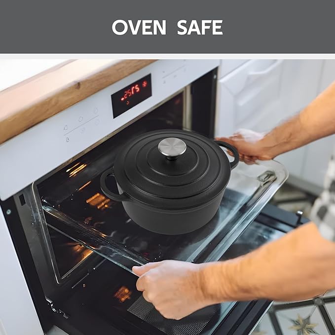 - This Dutch Oven from durable cast iron, the tight-fitting lid helps seal in heat and moisture, preserving the natural flavors and tenderness of your dishes.The enamel coating on both the interior and exterior provides added durability, prevents rusting, and makes it easy to clean.Cast iron is also a long-lasting material that can withstand years of use, reducing the need for frequent replacements and minimizing waste.
