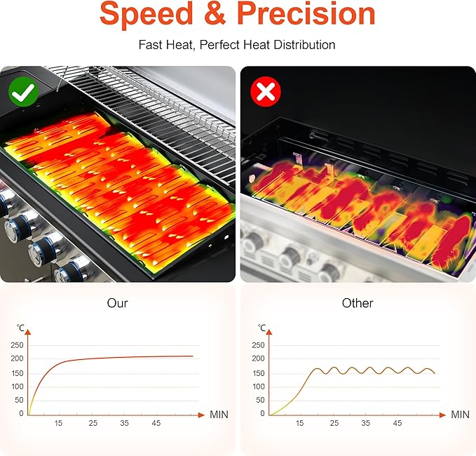 - Porcelain-Enameled Cast Iron: Heavier, Thicker, rust-resistant grates ensure superior heat conduction and even distribution. Creates perfect sear marks while resisting chipping for long-lasting professional results