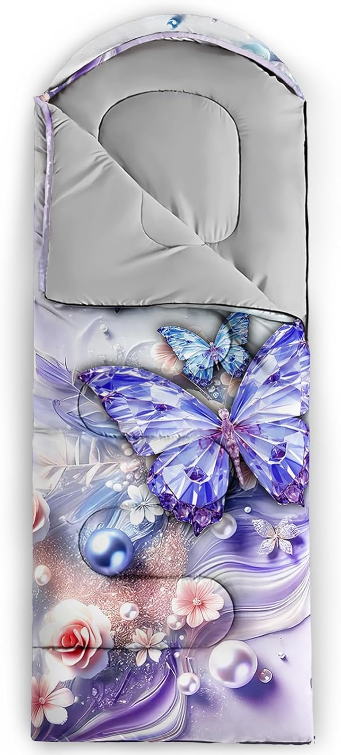 - Unique Butterfly Design:This Butterfly pattern sleeping bag is made of 3D digital printing with vibrant colors and patterns,size: 31W x 90L inches,temperature range: 32℉-77℉ (0℃-25℃),it also also have a weather resistant waterproof design to keep you warm and prevent you from any dampness,can be used in 3 seasons