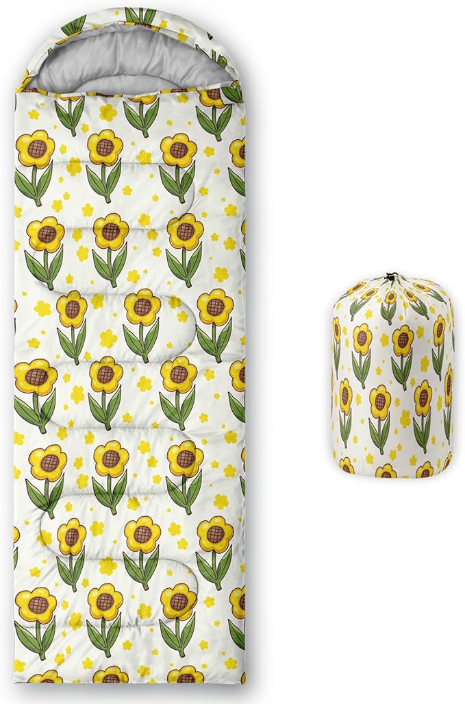 - Unique Sunflower Design:This Sunflower pattern sleeping bag is made of 3D digital printing with vibrant colors and patterns,size: 31W x 90L inches,temperature range: 32℉-77℉ (0℃-25℃),it also also have a weather resistant waterproof design to keep you warm and prevent you from any dampness,can be used in 3 seasons